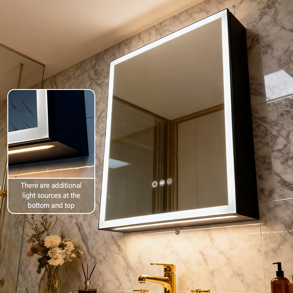 The sandblasted light strip along the cabinet frame provides gentle, non-dazzling light. Top and bottom auxiliary lights further improve brightness and create a comfortable, warm bathroom atmosphere.