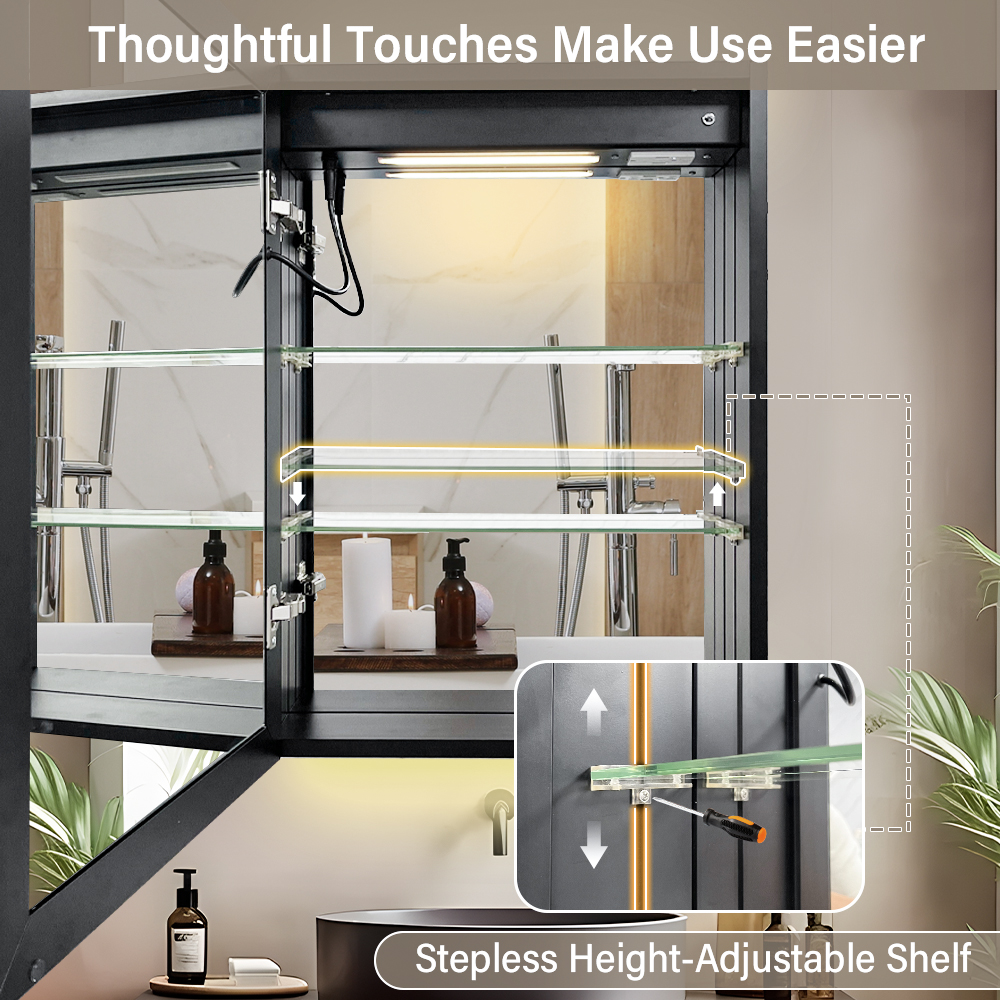 Built-in three-sided mirrors for multi-angle use. Height-adjustable high-strength tempered glass shelves offer strong load-bearing capacity and can be customized to fit items of different heights.