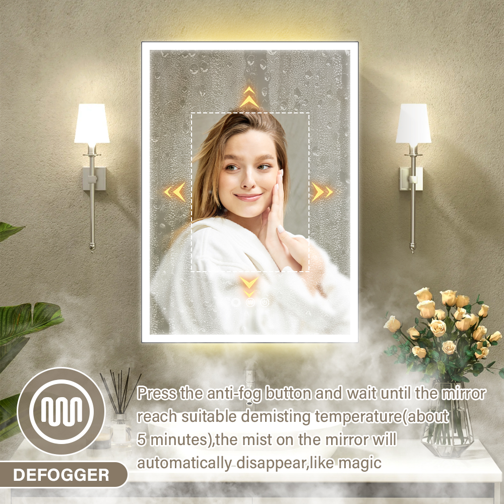 Controlled by a sensitive touch button on the lower right of the mirror. Short press to switch among 3 color temperatures (cool white, neutral white, warm white); long press to adjust brightness. The built-in memory function automatically saves your last setting.