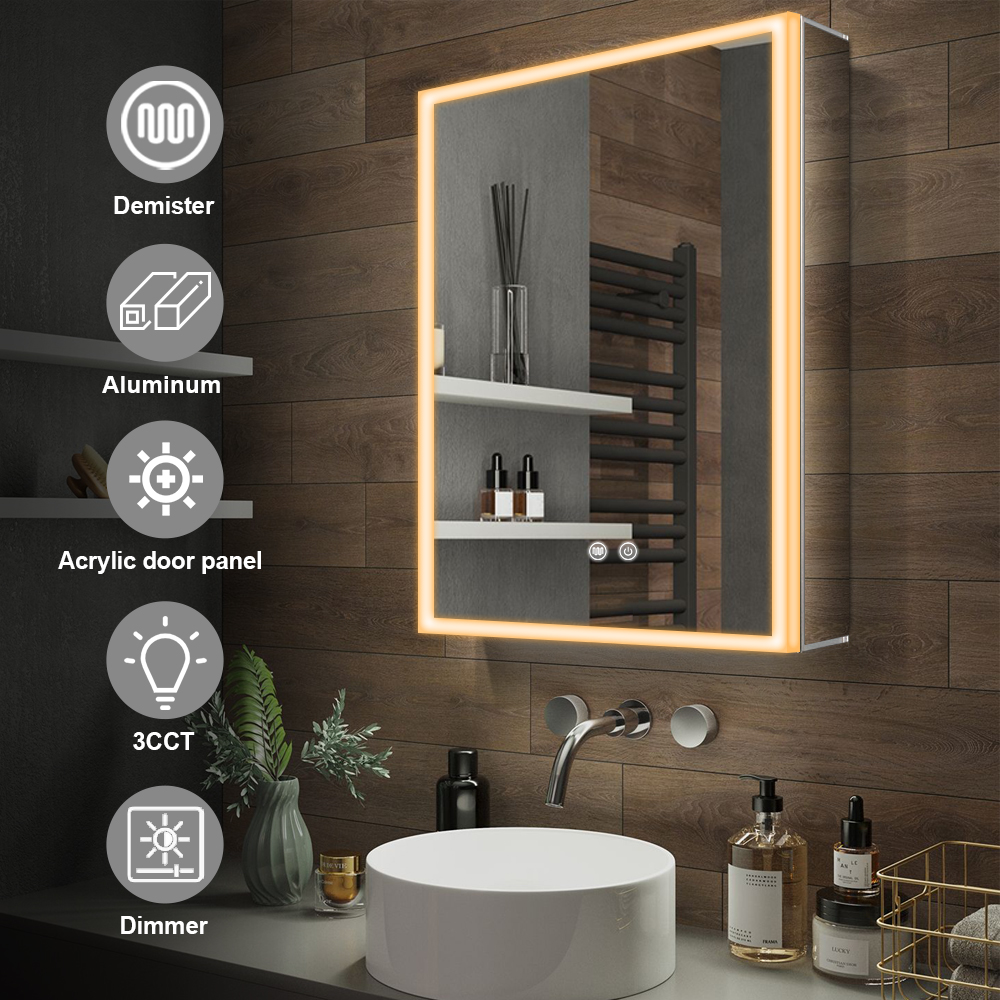 1. Adjustable LED Lighting: The acrylic mirror cabinet is equipped with adjustable LED lighting, allowing users to control the brightness as needed. The mirror cabinet is equipped with adjustable three-color temperature LED lighting (3000K/4500K/6500K), allowing users to choose the ideal color temperature for the best lighting effect. The 3000K provides warm yellow light, perfect for relaxation and rest; 4500K offers natural white light, ideal for daily grooming; and 6500K gives cool white light, suitable for makeup or situations requiring precise lighting. This LED lighting is not only energy-efficient and environmentally friendly but also remains cool even with prolonged use, ensuring a lasting and comfortable lighting experience for the user.