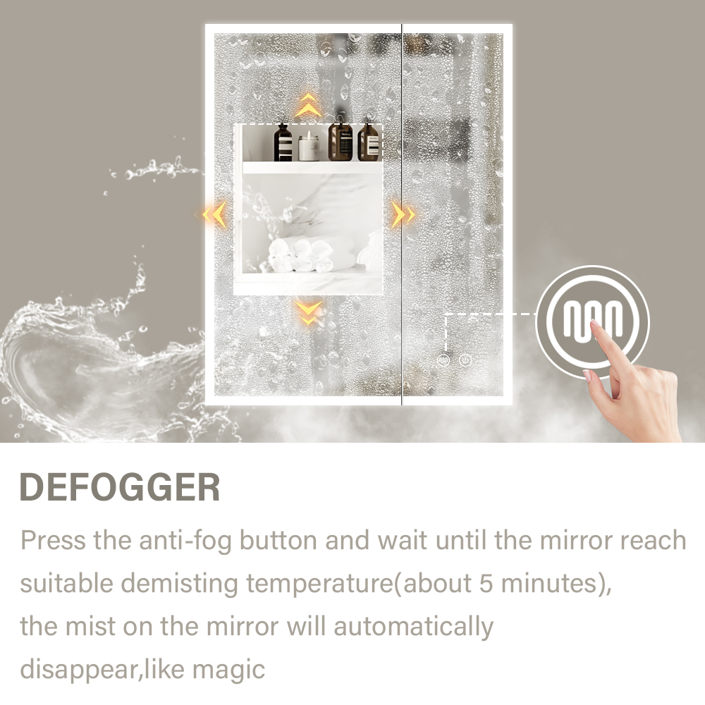 Bedroom Grooming & Organization Station Ideal for storing skincare, makeup, and jewelry, the cabinet’s double doors keep essentials tidy. 3CCT lighting optimizes morning routines (cool light for makeup) or evening relaxation (warm light), while the defogger ensures the mirror stays clear—streamlining daily rituals.