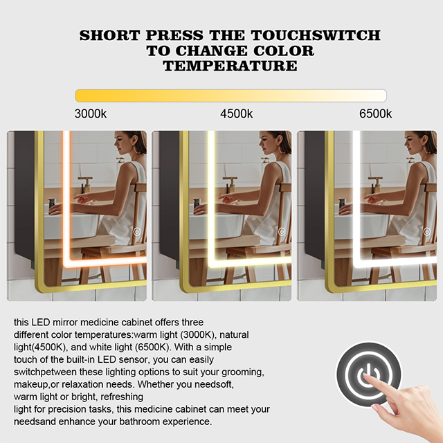 This LED mirror medicine cabinet offers three different color temperatures: warm light (3000K), natural light (4500K), and white light (6500K). With a simple touch of the built-in LED sensor, you can easily switch between these lighting options to suit your grooming, makeup, or relaxation needs. Whether you need soft, warm light or bright, refreshing light for precision tasks, this medicine cabinet can meet your needs and enhance your bathroom experience.
