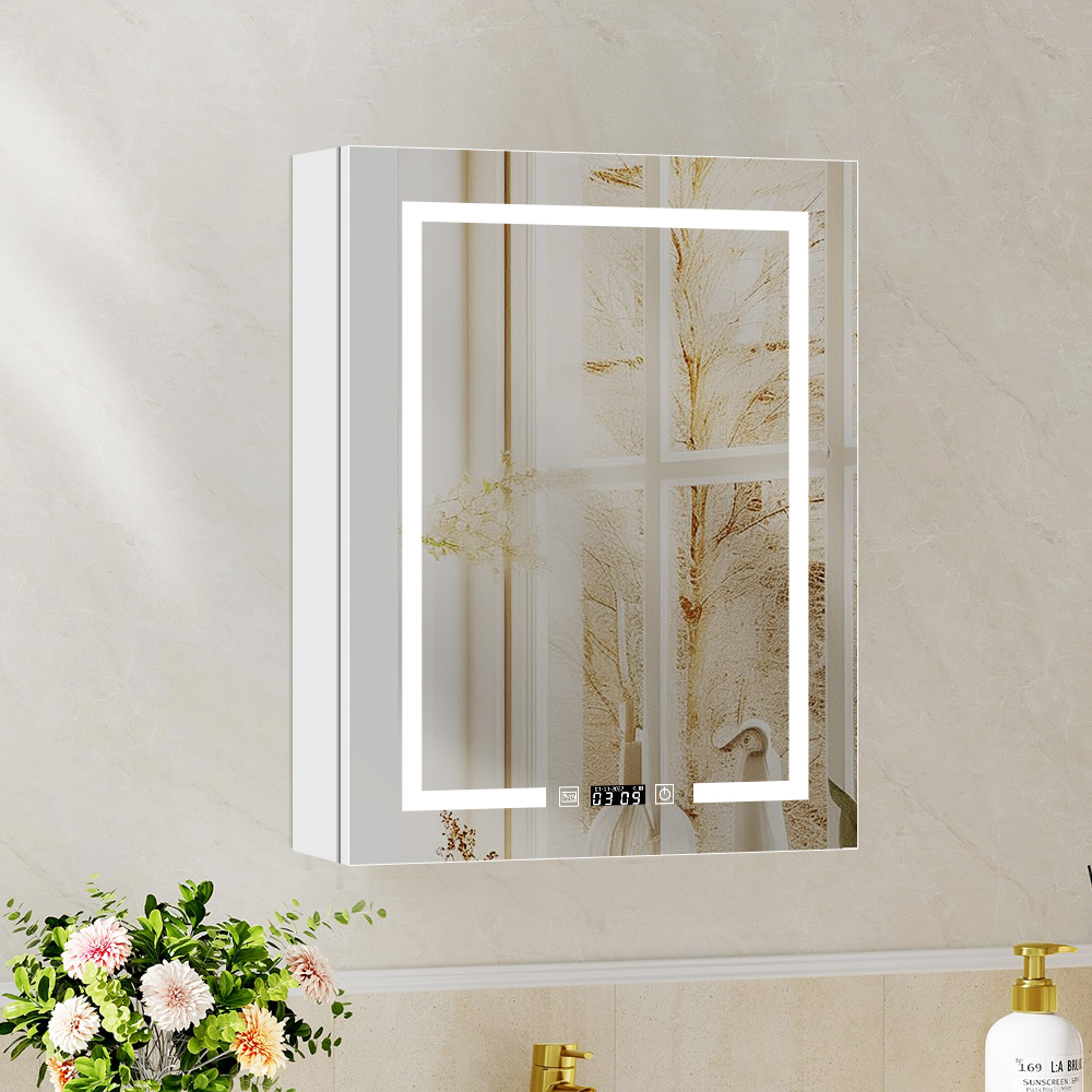 As a single-door LED mirror cabinet, it provides compact yet efficient storage for toiletries, skincare, and grooming tools, keeping countertops clutter-free. Its user-centric features elevate daily routines: dimmable LED lights adjust from soft ambient glow to bright task lighting for precise grooming; a built-in defogger quickly clears post-shower condensation, maintaining a crystal-clear mirror surface without manual wiping; and an integrated clock helps you stay on schedule during busy mornings or evenings.