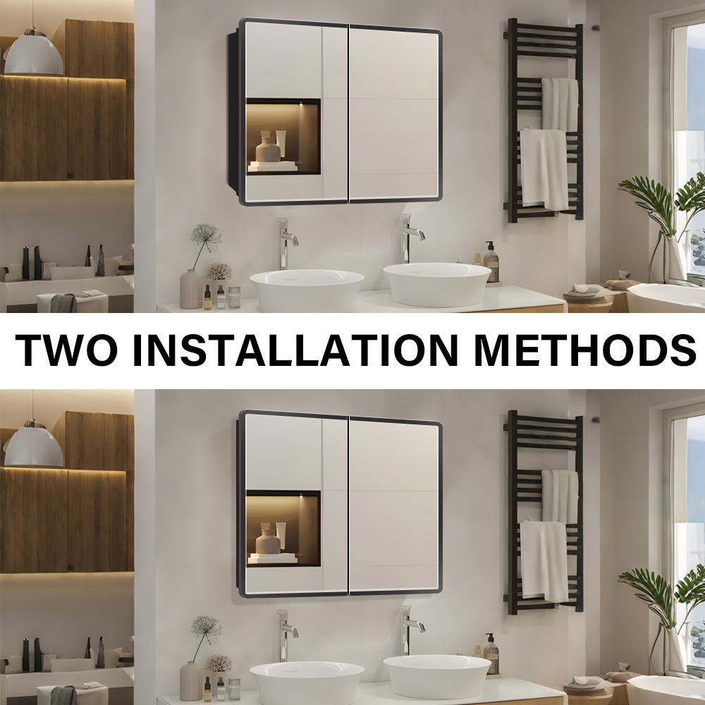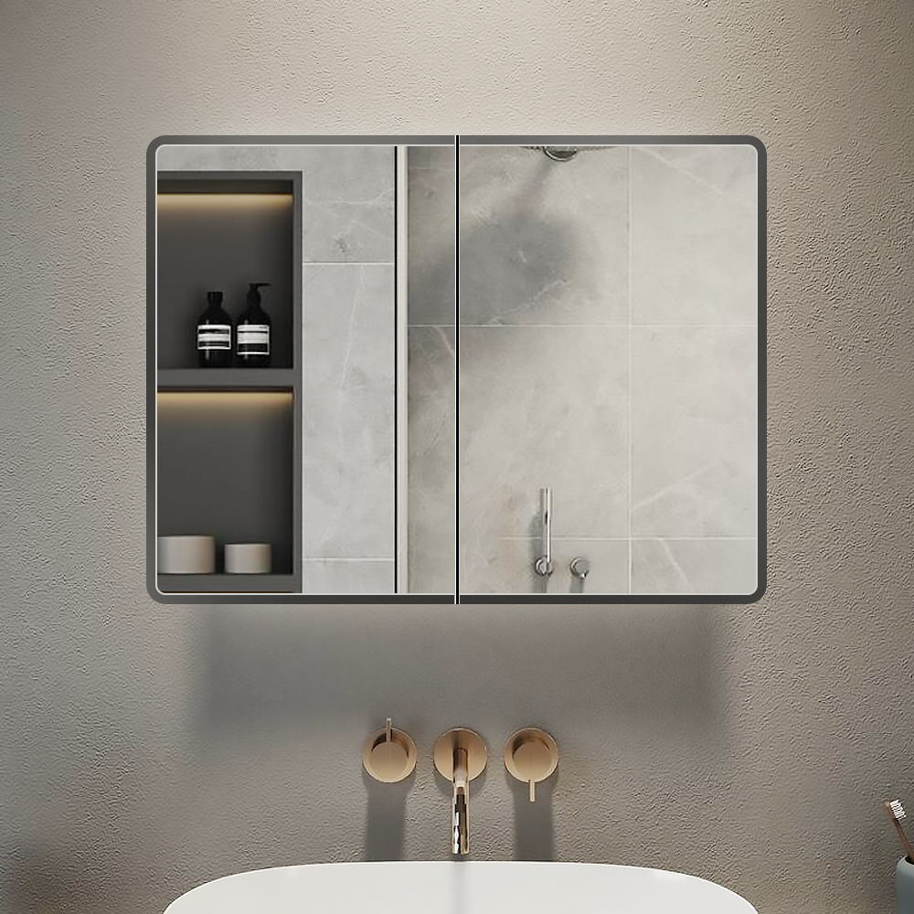 Its recessed design fits flush with the wall, eliminating bulky protrusions and maximizing floor and counter space, making it perfect for compact bathrooms or powder rooms. The thoughtful R-shape corner replaces sharp edges with smooth curves, enhancing safety while adding a refined visual touch to modern decor. The double-door structure provides ample, segmented storage for toiletries, skincare, and grooming tools, keeping countertops clutter-free and essentials within easy reach.