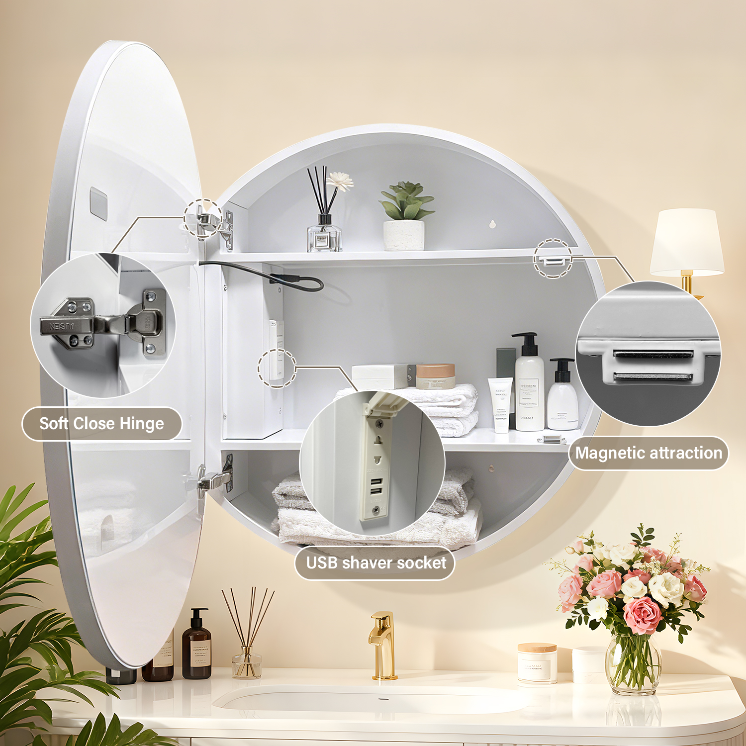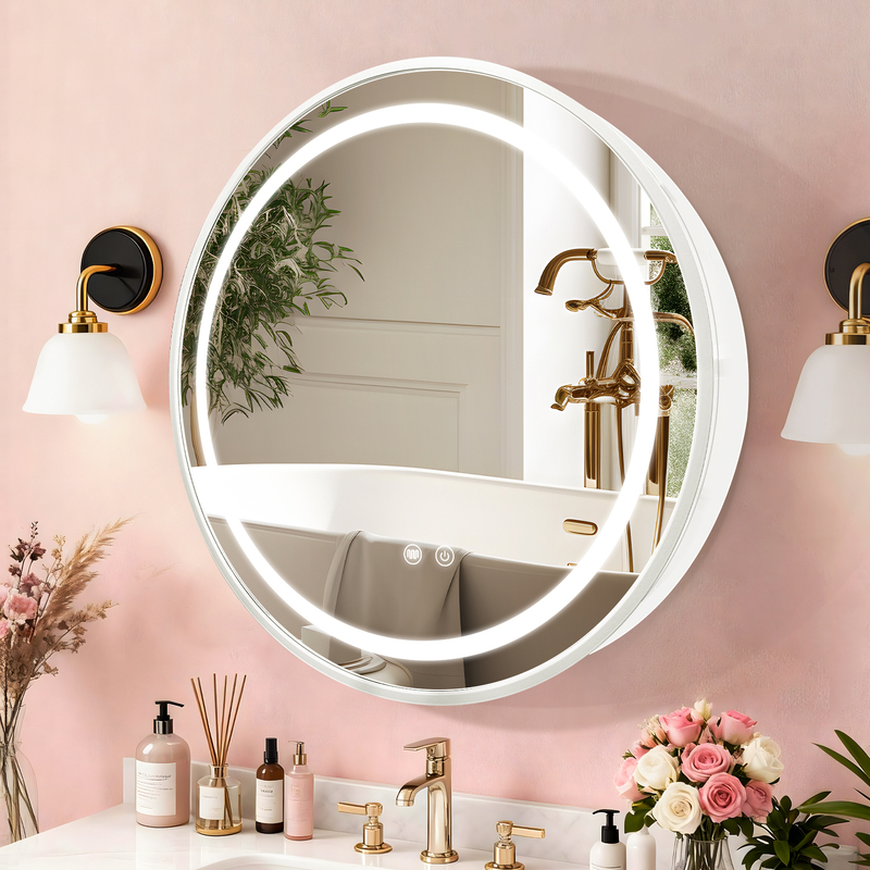 This round LED mirror cabinet boasts an elegant, modern design with a clean white finish, perfectly complementing any contemporary bathroom decor. The sleek circular silhouette and integrated LED ring light create a sophisticated focal point, blending seamlessly with your vanity setup while adding a touch of luxury to your daily routine.
