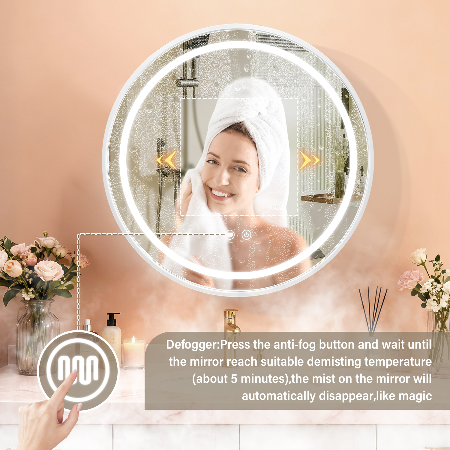 The built-in anti-fog heating element keeps the mirror crystal clear even after hot showers. Simply press the anti-fog button, and within 5 minutes, the mirror will reach the optimal demisting temperature, eliminating fog automatically and ensuring a sharp reflection at all times—no need for manual wiping.