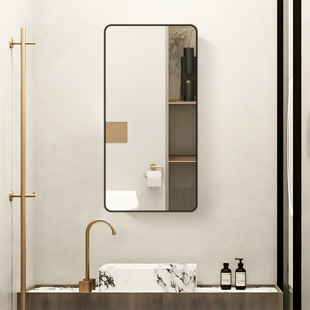 The CTS-4080 features a tall, narrow rectangular design with rounded corners and a matte black steel frame, creating a minimalist, sophisticated look that complements neutral, modern, and industrial bathroom decor. The frameless mirror provides a full, clear view, while the slim profile keeps your space looking clean and uncluttered.
