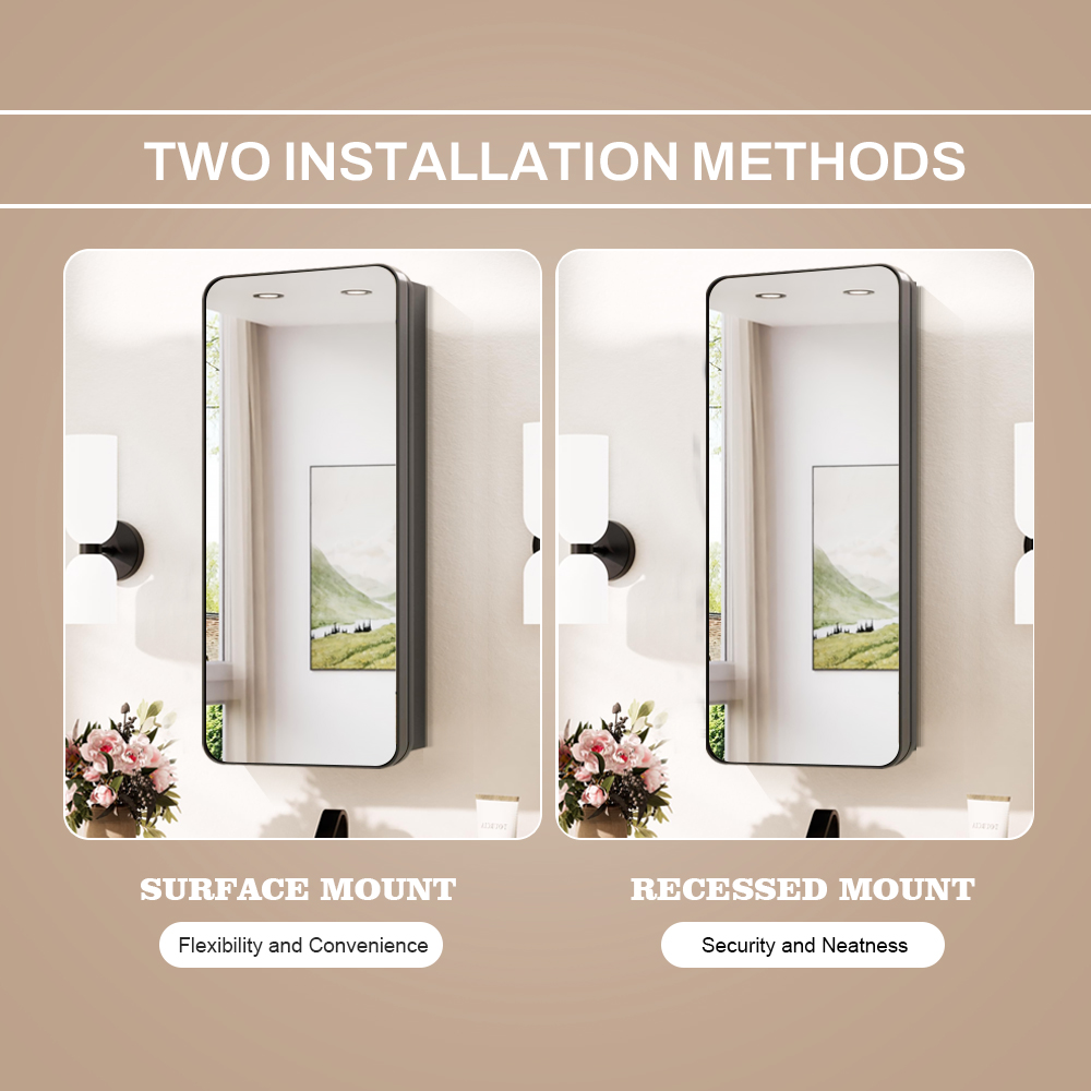 A standout feature is its versatile installation options: you can choose between surface mounting for easy, no-renovation installation, or recessed mounting for a flush, built-in look that maximizes space and creates a seamless aesthetic. This flexibility makes it suitable for both new construction and bathroom renovations.