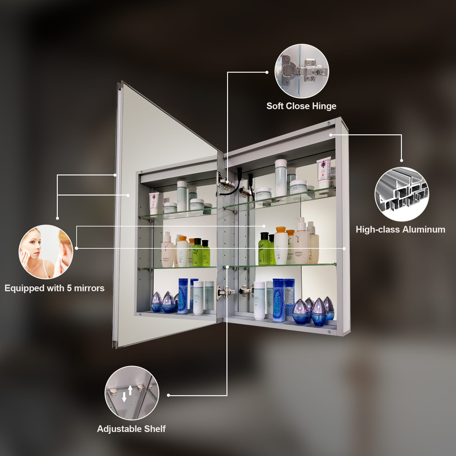 This mirror cabinet features a multi-faceted mirror design with internal mirrors on the doors, anodized aluminum frame, soft-close hinges, and two adjustable tempered glass shelves. It can be recessed or wall-mounted to provide flexibility.