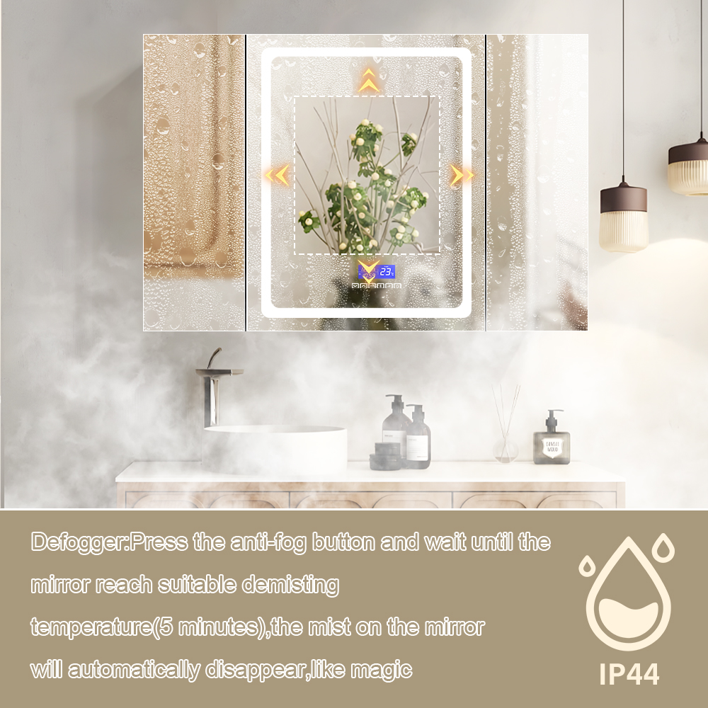 Say goodbye to foggy mirrors after hot showers with the built-in defogger. Simply press the anti-fog touch button, and the mirror will heat to an optimal demisting temperature in approximately 5 minutes, automatically clearing steam and moisture for a crystal-clear reflection, no manual wiping required. The cabinet is also IP44 waterproof rated, ensuring durability in humid bathroom environments.