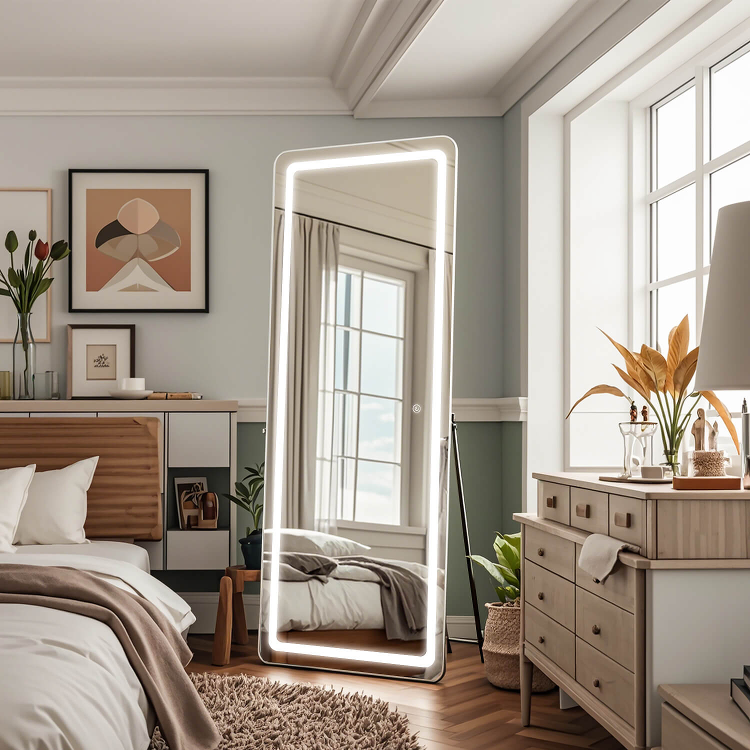Bedroom: Place it in the bedroom as a focal point. Wall-mounted it above the dresser or use the free-standing option near the window. The mirror provides perfect illumination for getting ready in the morning, from styling your hair to choosing accessories.