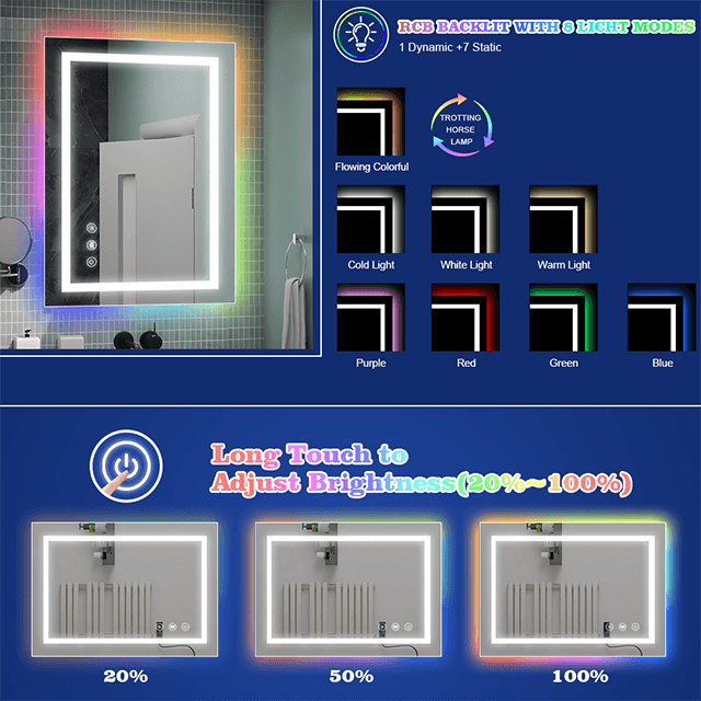 [RGB Backlighting]The LED mirror comes with customizable RGB backlighting that offers 8 vibrant color modes, including warm, netural, cool, flow, purple, red, green, and blue. Whether you want multi-color mood lighting or bright, clean light for dressing, this mirror cabinet has you covered.