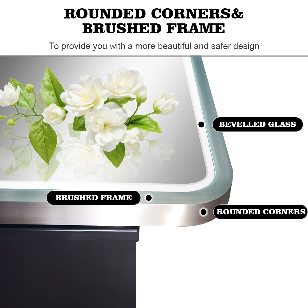 The CTS-5171-S showcases a refined brushed silver aluminum alloy frame with smooth rounded corners and premium beveled glass. This minimalist, high-end design adds a contemporary touch to any bathroom decor while eliminating sharp edges for improved family safety.