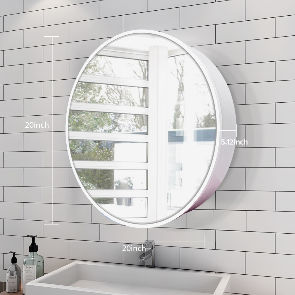 With a 20-inch round shape and 5.12-inch depth, this mirror cabinet offers generous storage space inside, equipped with fixed iron shelves to organize your toiletries, cosmetics, and skincare products neatly. The compact yet spacious design maximizes vertical space, perfect for small and medium-sized bathrooms.