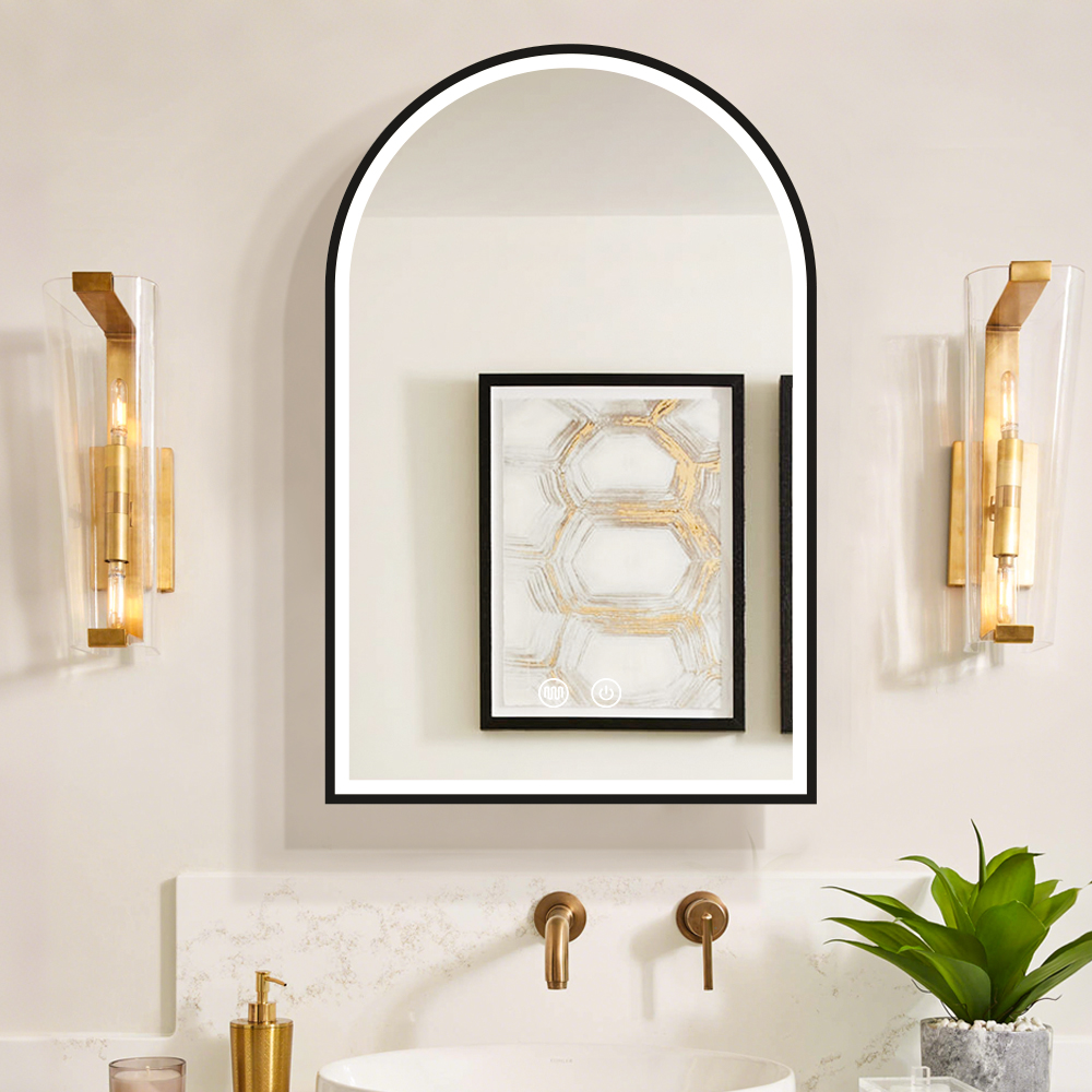 The CTS-5080 features a stunning arched silhouette with a sleek black powder-coated steel frame, adding a sophisticated, minimalist touch to any bathroom decor. The smooth, curved mirror edge creates a soft, elegant look that complements both contemporary and traditional spaces, while the durable steel construction ensures long-lasting performance in humid environments.