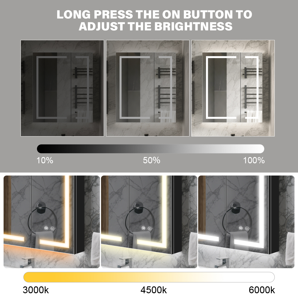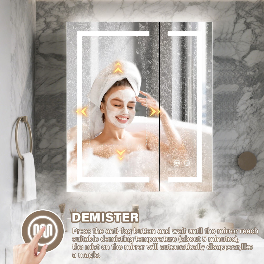 Say goodbye to foggy mirrors after hot showers with the built-in defogger. Simply press the anti-fog touch button, and the mirror will heat to an optimal demisting temperature in approximately 5 minutes, automatically clearing steam and moisture for a crystal-clear reflection, no manual wiping required.