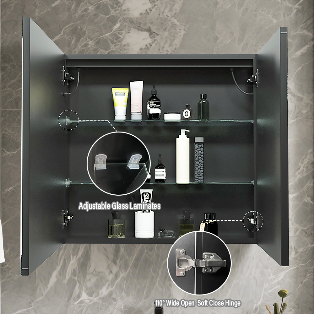 Inside, the cabinet offers ample, organized storage space with two adjustable glass shelves, letting you customize the layout to fit toiletries, cosmetics, and bathroom essentials of different sizes. The cabinet is equipped with premium 110° wide-open soft-close hinges that ensure the doors close gently and quietly, eliminating slamming and extending the product’s lifespan.