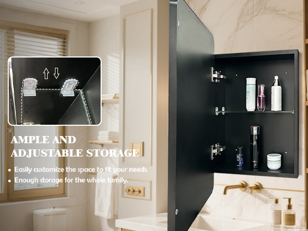 Inside the cabinet, adjustable glass shelves provide customizable storage space for toiletries, cosmetics, skincare products and other daily essentials. You can easily adjust the height of each shelf to accommodate items of different sizes, keeping your countertop clutter-free and your bathroom well-organized. The durable glass shelves are easy to clean and resistant to moisture, perfect for the humid bathroom environment.